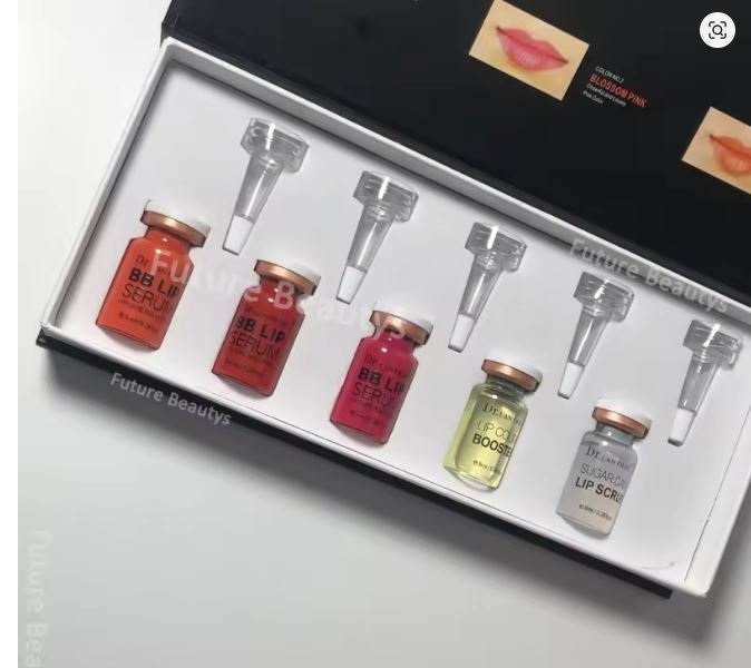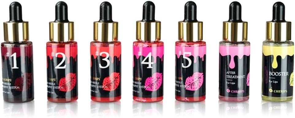 Kissum tint para labios consta de 7 frascos, 5 colores, solución de pretratamiento, y solución de postratamiento.