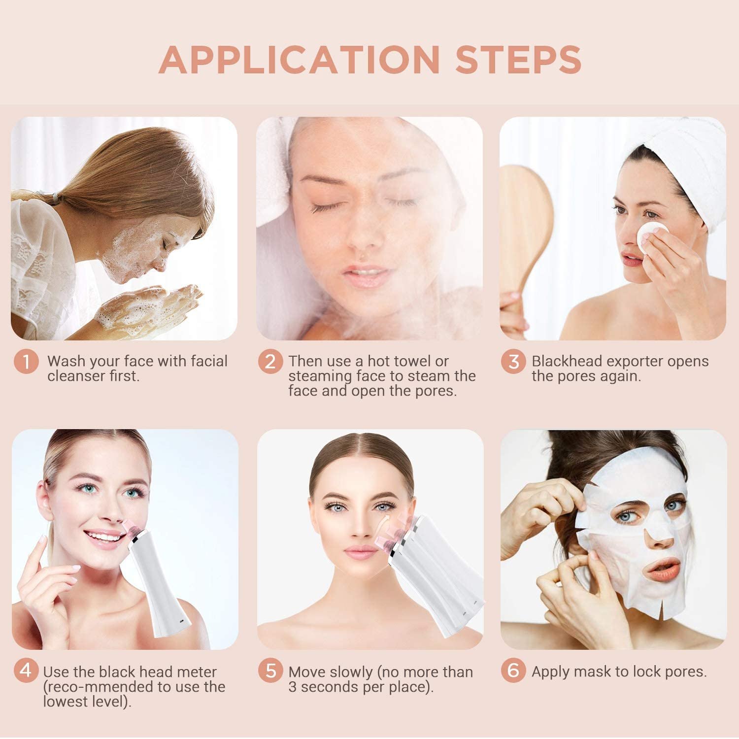 - Limpiador de Puntos Negros: Diseñado con bomba de aire importada y una aspiración fuerte. Fácilmente limpia los puntos negros y acnés, blanquea y rejuvenece su cara, y luego reduce las líneas finas.