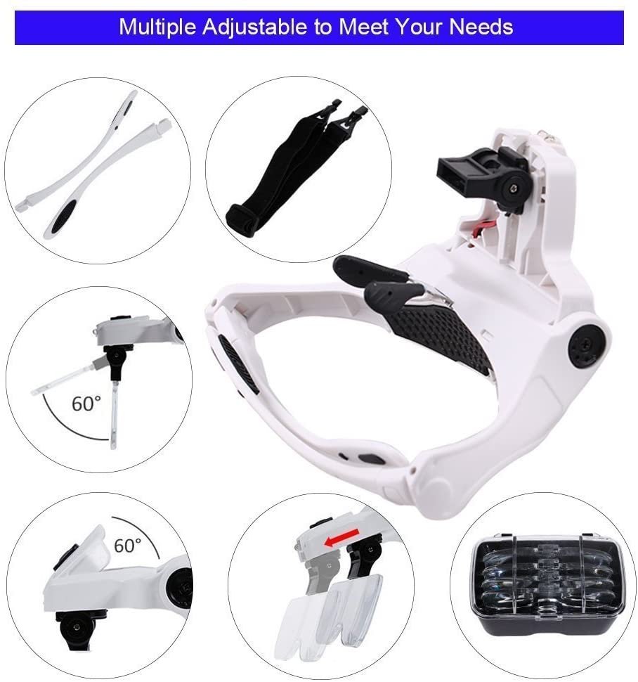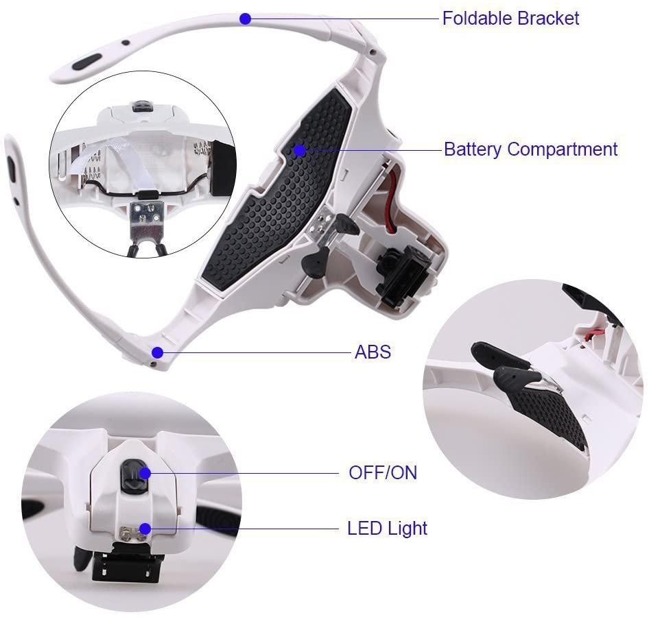 - 2 luces LED: Visor de aumento bastante ligero y con buena calidad de acabado, la luz apunta a donde se mira y la lente se mueve para poder ver mucho mejor. Muy cómodas de usar y ligeras(3*AAA pilas No incluidas)