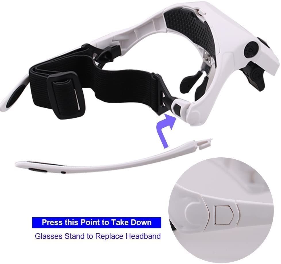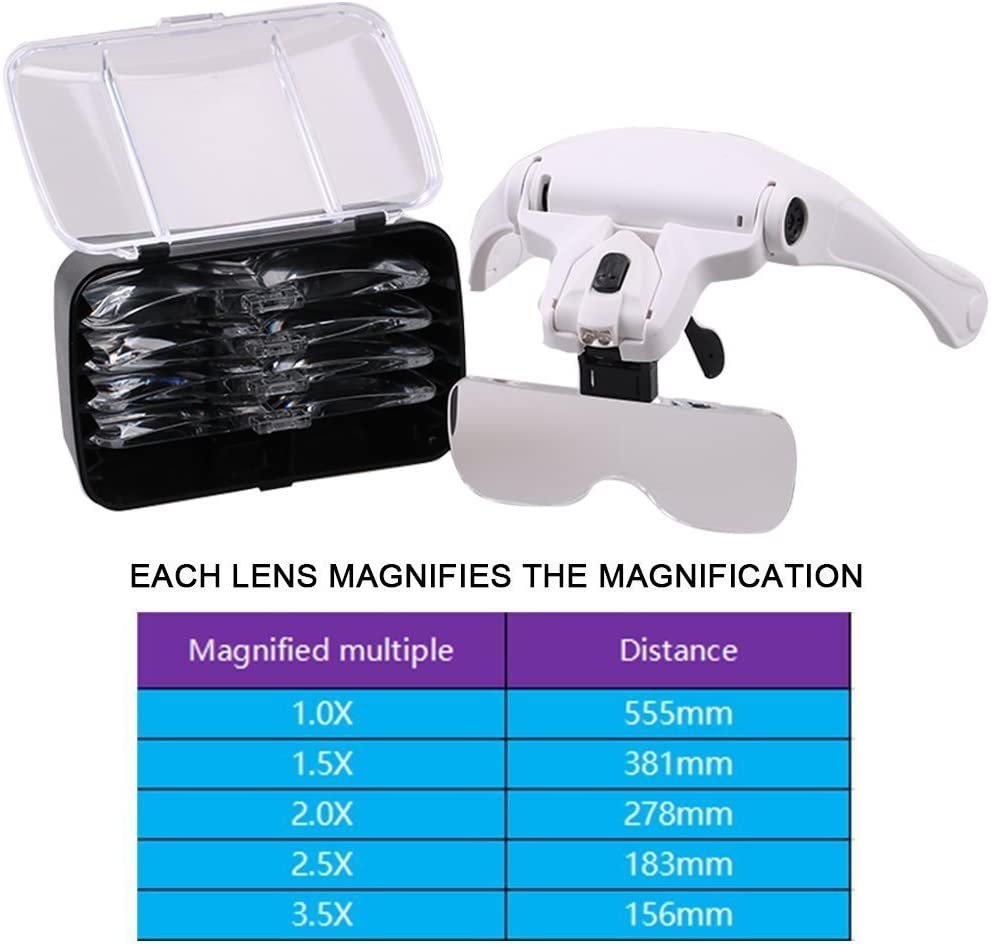 - Cinco Lentes Intercambiables:1.0X, 1.5X, 2.0X, 2.5X, 3.5X.Las distintas lentes encajan con suavidad y se pueden retirar facilmente,si lo quieres más grande te pones la que más amplía y te acercas más. Se pueden usar junto con tus gafas normales si es que usas gafas.