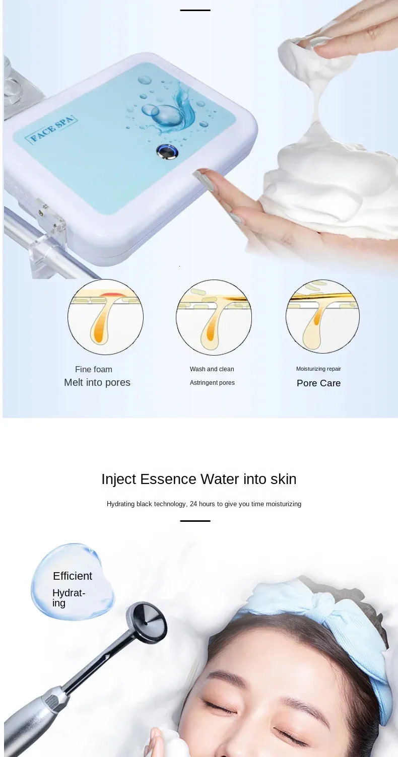 El oxígeno activo tiene una fuerte presión de filtración y capacidad antioxidante. Puede descomponer y esterilizar rápidamente la grasa, la suciedad y las bacterias en la piel e incluso los poros, y puede eliminar completamente la suciedad de la piel. Esta tecnología ha sido reconocida por la Sociedad Japonesa de oxígeno activo. A través del principio físico y químico del oxígeno activo, la piel profunda se lava para lograr el efecto de limpieza profunda Las burbujas de oxígeno activo tienen los efectos de esterilización, desinfección, decoloración y limpieza.